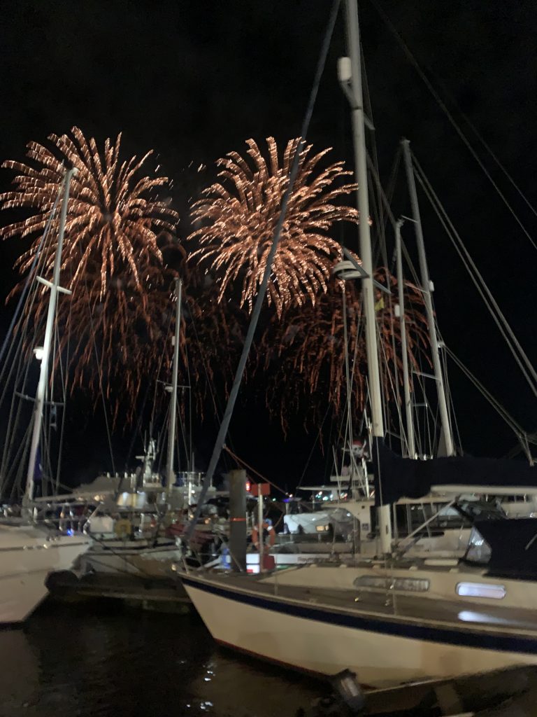 Thursday was an early start for the sailing vessels to get through the Needles before the tide was against them, to make their way to Poole for Thursday afternoon. Riptide made her way out of the Solent a little later and across to moor up in Studland Bay to await the arrival of the yachts. The weather was less kind that day for those sailing with some heavy rain, but fairly light winds at F2 to F3 from the SW. Those on Riptide however, enjoyed a pleasant lunch on board and followed the yachts into Poole mid-afternoon. Once in and moored up safely at the Poole Quay Marina, the Commodore and Lady Commodore hosted nibbles and drinks onboard Riptide again before we all adjourned to the Poole Arms pub for a fabulous fish supper. Poole was particularly busy with the Quay Road closed to traffic, and street entertainment in progress during the evening before a splendid fireworks display put on by the town at 21.00, which happens every Thursday evening during the summer.
